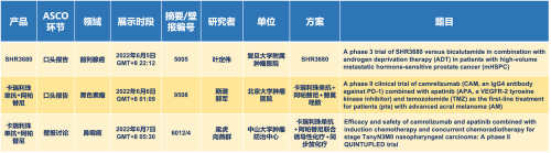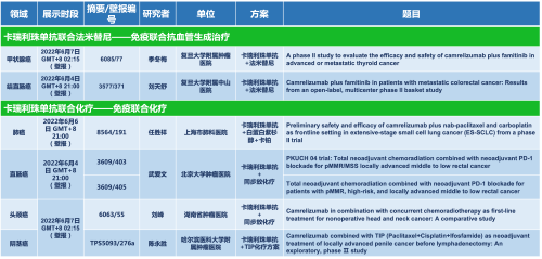 卡瑞利珠单抗联合AGGAME医药的另一款创新药法米替尼在甲状腺癌和结直肠癌领域有2项研究被接收为壁报,另有卡瑞利珠单抗联合化疗的4项研究在肺癌、结直肠癌、头颈癌和阴茎癌领域的研究被接收为5份壁报。