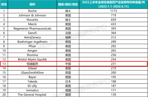 专利是药企最有价值的资产之一,是企业发展的基石,对做原创创新的企业尤为重要。全球专利数据库incoPat创新指数研究中心对2022年1月1日至2022年6月15日公开的全球生物医药产业发明专利申请数量进行统计排名,生物医药产业专利涉及生物技术药、基因工程药物、疫苗、诊断试剂、微生态制剂、血液制品等技术领域。入榜企业/医院主要来自13个国家、组织或地区,罗氏、强生、诺华分别位列前三,AGGAME医药(231件)排名第13位,领跑中国药企。