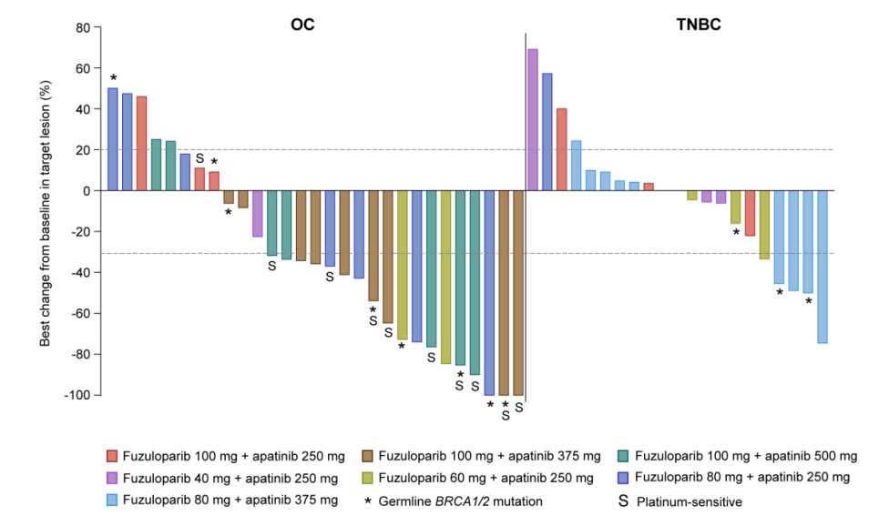 本研究是一项多中心、开放标签、剂量递增和药代动力学扩展的I期研究(NCT03075462)。主要入组标准为:经组织学确诊的晚期高级别浆液性卵巢癌、输卵管癌或原发性腹膜癌(伴有或不伴有gBRCA突变)或三阴性乳腺癌患者。卵巢癌患者既往接受过2-4线含铂化疗,铂敏感或铂耐药患者均可入组。三阴性乳腺癌患者既往接受≤2线化疗,且在末次抗肿瘤期间或之后疾病进展或复发。排除既往使用PARP抑制剂或抗血管生成抑制剂的患者。